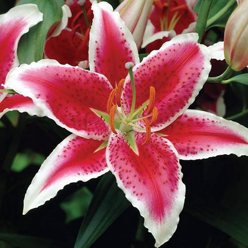 Лилия Старфайтер (Starfighter) – это великолепное украшение для вашего сада, которое привнесет в него яркие краски и изысканный аромат. Этот сорт лилии отличается крупными, насыщенно-розовыми цветками с темно-красными пятнами и белыми краями, которые создают эффектный контраст. Лепестки слегка волнистые, что придает цветку дополнительную текстуру и объем.
